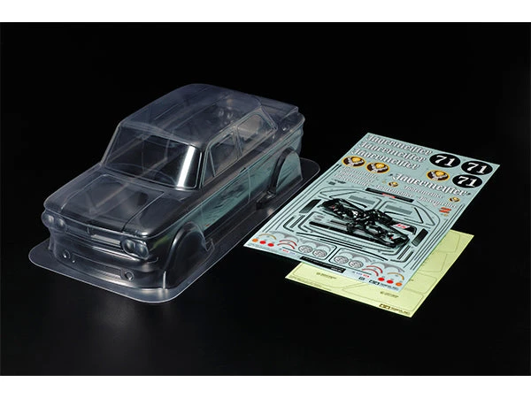 This is a complete spare body parts set of the NSU TT Jägermeister. The set includes the team livery sticker set, window masking tape, and plastic side mirrors.