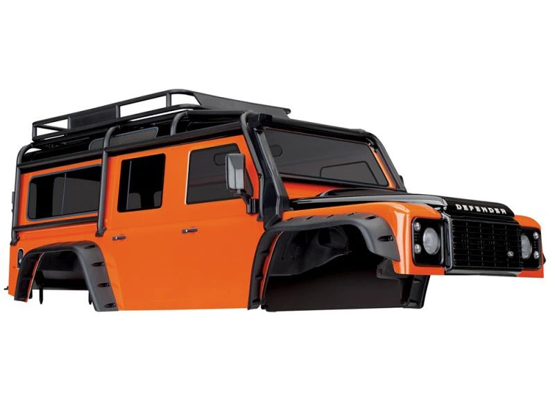 This special edition orange and black Defender body comes pre-cut, painted with applied decals, and ready to mount on the TRX-4 chassis (324mm). The body is fully assembled with a complement of highly detailed scale parts including Exocage, inner fenders, fuel canisters, snorkel, grill, and jack.